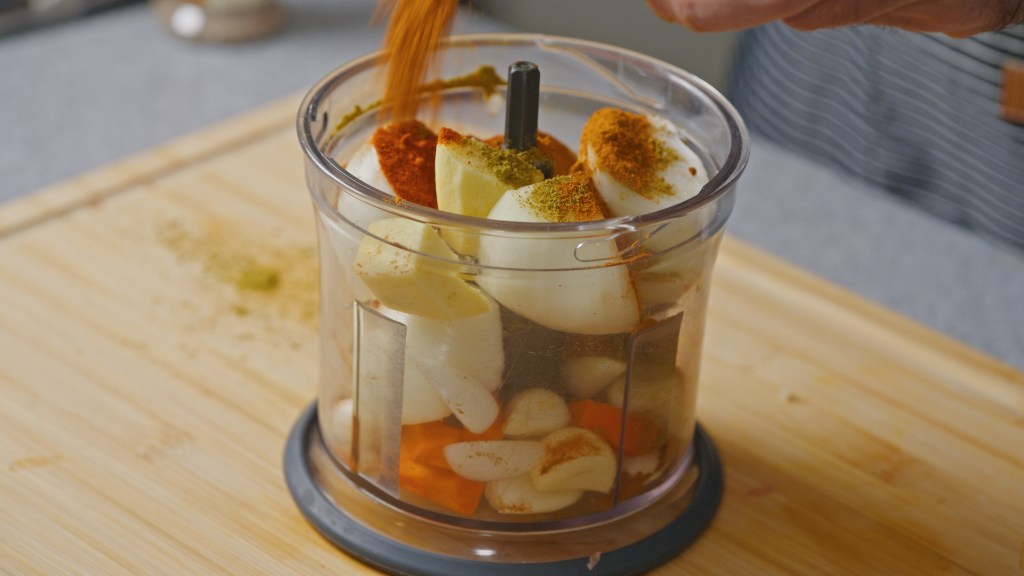 Blend the Base: Combine 1.5 onions, 1.5 bulbs garlic, thumb-sized ginger, 3–4 turmeric roots, pinch of salt, handful of ground cumin, handful of fresh coriander, 2 tsp cayenne pepper, 2 tsp hot paprika, and 4 tbsp neutral oil in a blender. Process until smooth, scraping down the sides to form a vibrant, aromatic paste.