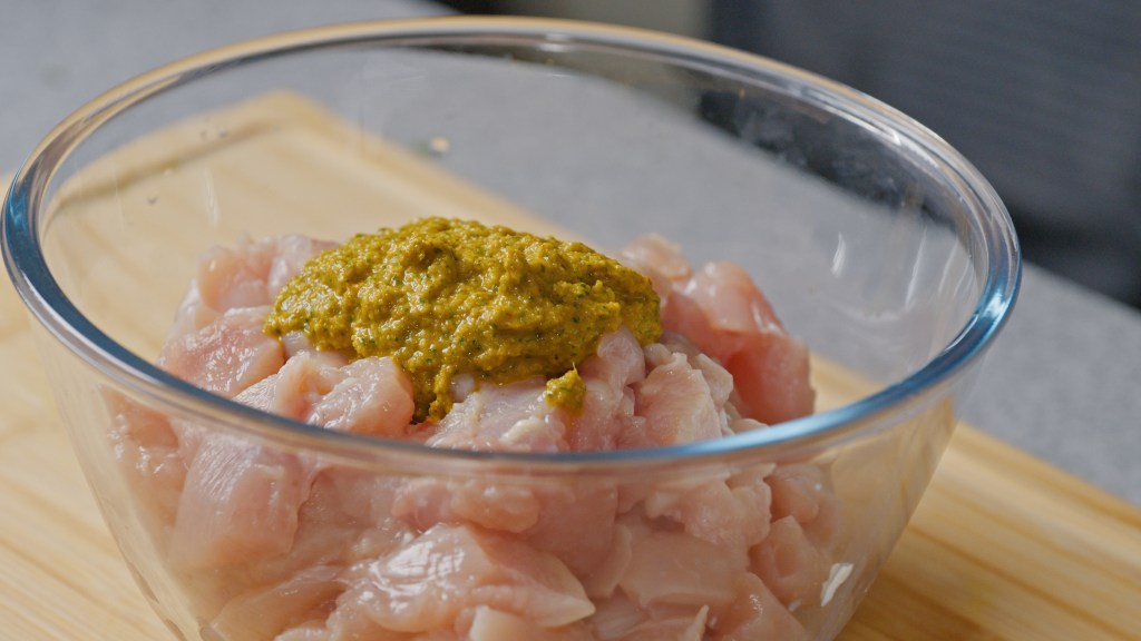 Dice and Marinate: While the paste simmers, rinse 900 g chicken breast under cold water and dice into bite-sized pieces. In a bowl, mix the chicken with 3 tbsp of the cooked paste, ensuring every piece is coated. Let it sit briefly to soak up the spices.